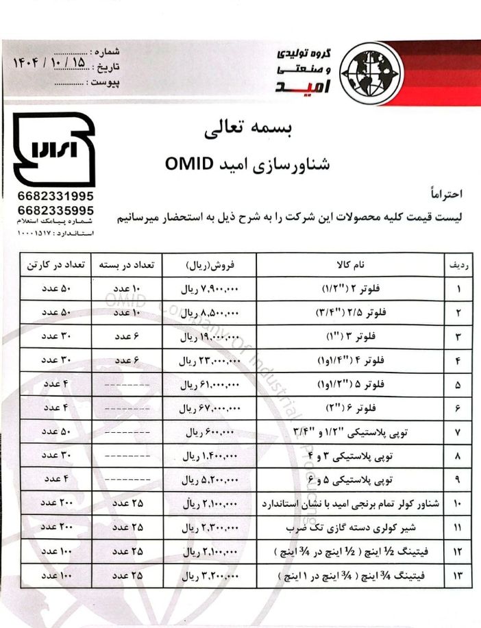 لیست قیمت فلوتر امید در نمایندگی کشیشی